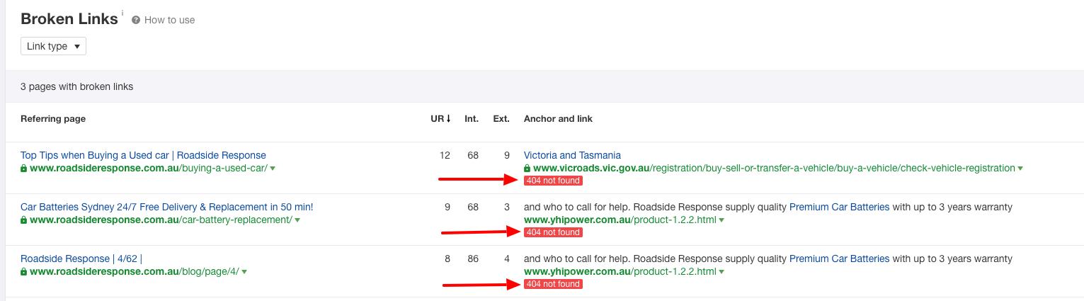 If you are wondering how to find these broken links, pop the URL into Ahrefs, scroll down the menu on the left, and click on broken links. You will then see something like this. The red ‘404 not found’ message indicates these are broken links.