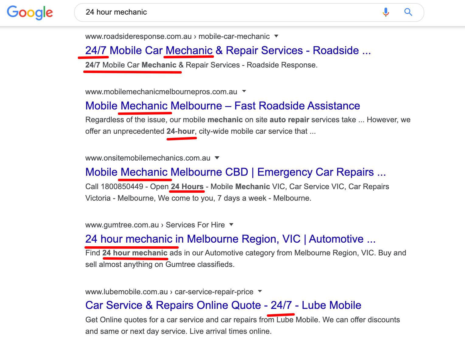 As you can see, ‘24 hour’ and ‘mechanic’ are in all search results. So what we need to do now is jot down the other keywords that may be relevant to your product or service. Here are a few I found: