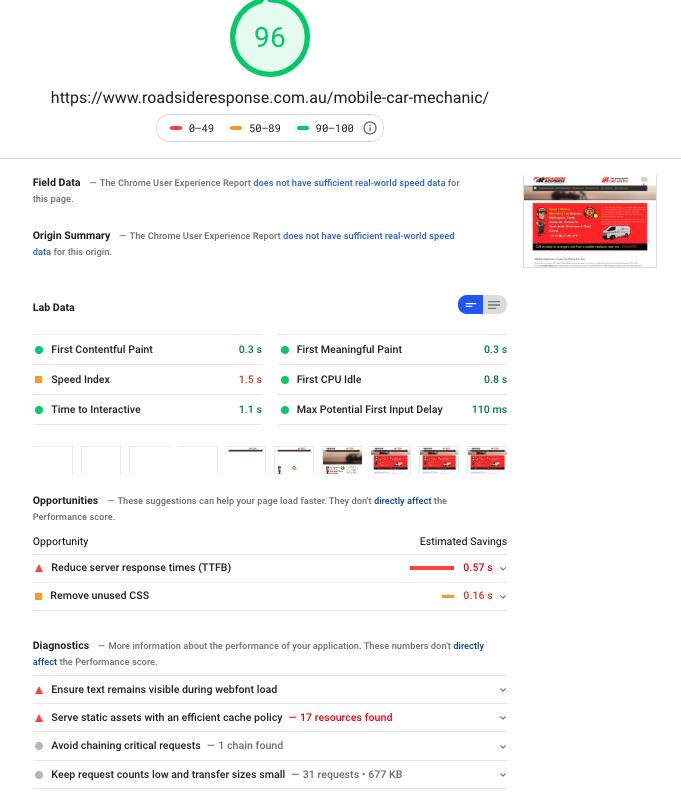 I’ve gone ahead and popped one of the mobile mechanic sites into Google’s PageSpeed Insights to show you the type of information you will see when testing your website speed.