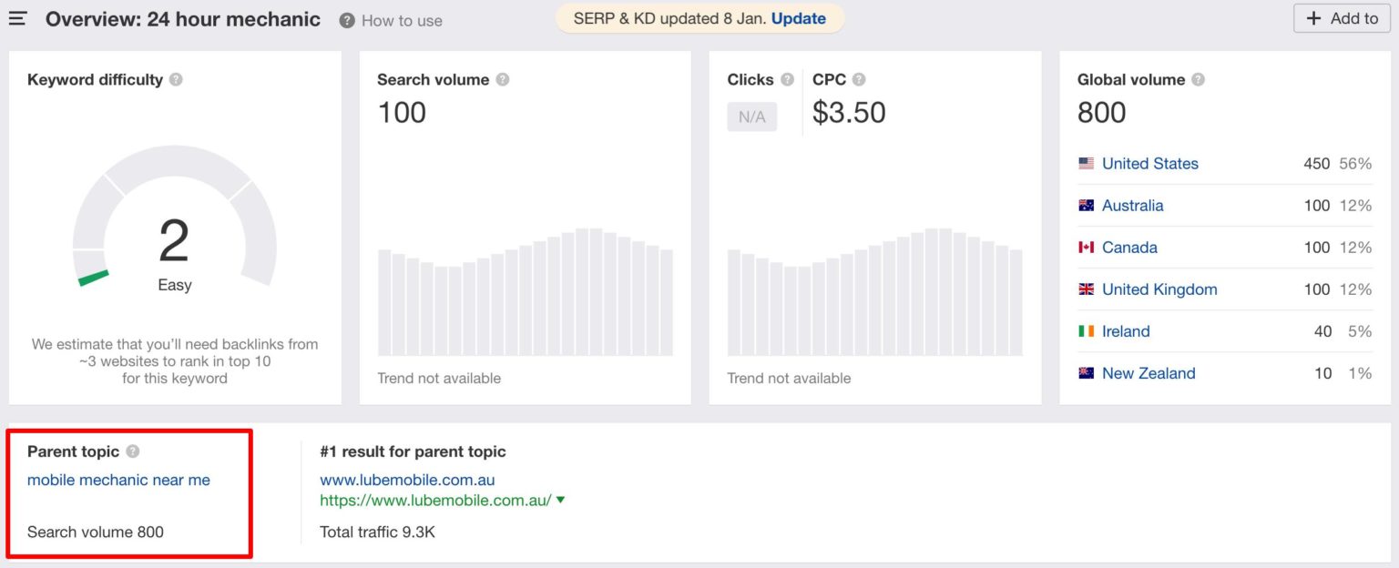 Now that I have checked the keywords ‘24 hour mechanic’, I can see that the parent topic for this search term is actually ‘mobile mechanic near me’.