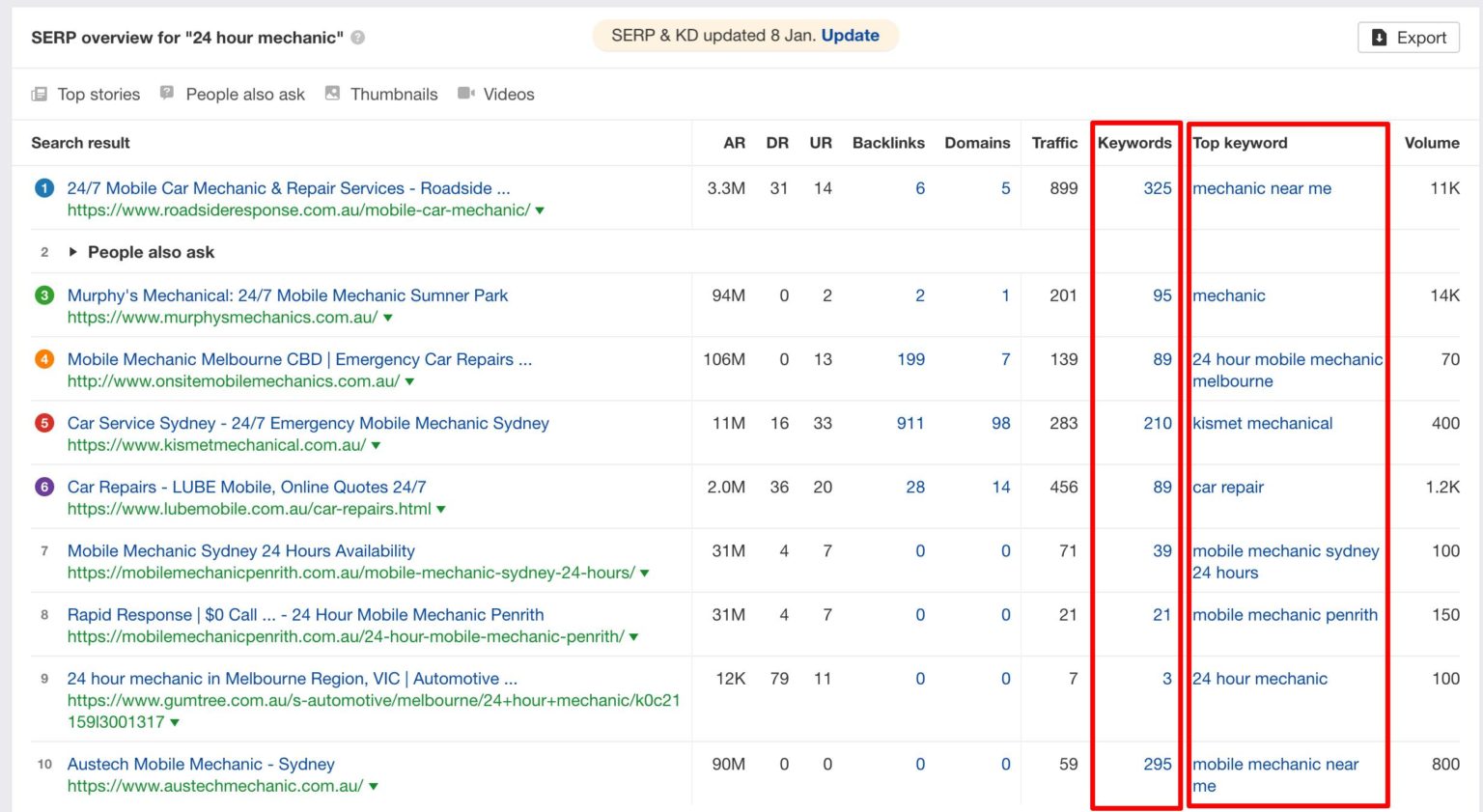 Your next step is to look at the SERP overview in the Ahrefs Keyword Explorer. Take note of the number of keywords the top 10 websites rank for.