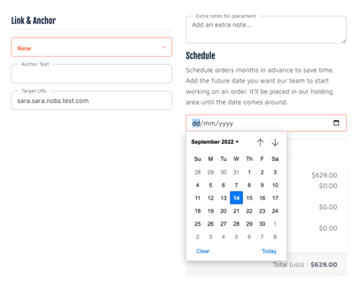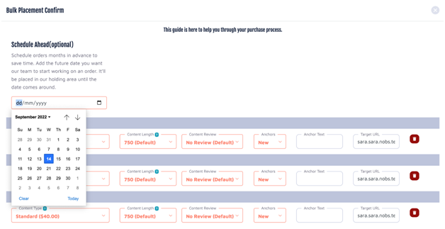 Scheduling your link building orders ahead of time is now possible with the NO-BS platform. If you want to know more about this feature. Contact us today for more information.