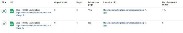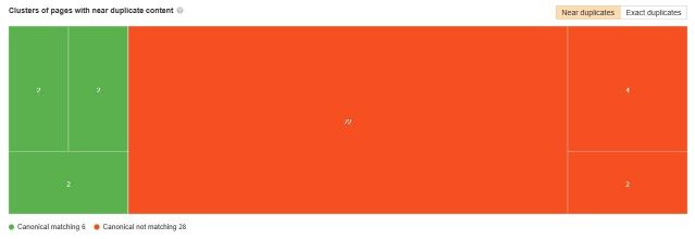 You can detect potential duplicates with SEO auditing tools, such as Ahrefs Site Audit. The tool reports the number of page clusters with a matching canonical tag and those without one. Here’s an example using the NO-BS Marketplace website.