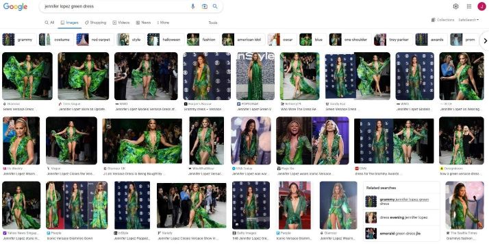 - No alt tags. Image search has grown cleverer through the years. It all began with a spike in demand to see Jennifer Lopez’s green Versace gown, which she wore at the Grammy Awards in 2000. Today, searching for “jennifer lopez green dress” is easy as pie for Google.