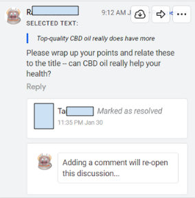 So in this example above you can see our Editor—let’s call her Mrs. R—is editing one from a writer by the name of Mr. J, whom we hired. Then when it comes to resolving comments left by our editor, someone by the name of Ms. T has resolved them.