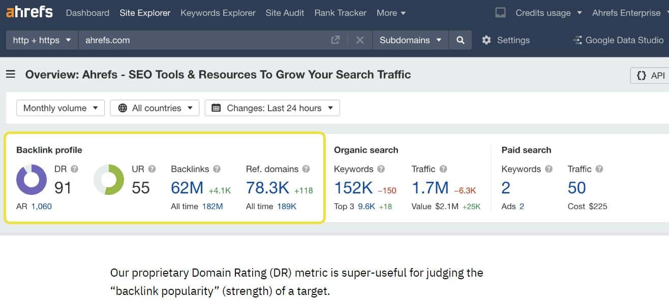 Ahref's propriety metric is calculated using different factors and ranges from zero to one hundred, like Moz's domain authority metric. Higher ratings mean the site is more authoritative.