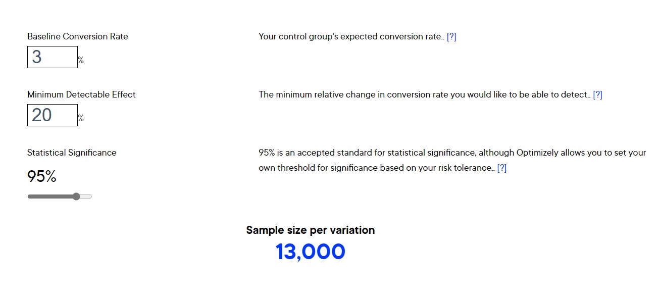 You can plug these numbers in a sample size calculator, such as this one from Optimizely. It’ll automatically generate a recommended sample size for testing every possible variation.