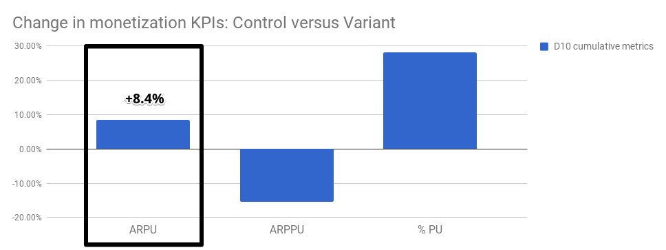 The data suggests that the version with the pop-up feature generated a 27% increase in player conversion and an 8.4% increase in average revenue per unit (ARPU). The only aspect it falls short on is the average revenue per paying user (ARPPU), where it performed worse than the original. But so far, so good, right?