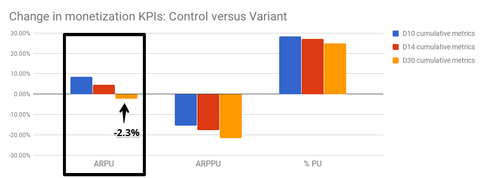 The developers decided to let the test play out for a little longer. By day 30, the version with the pop-up had performed worse than the original in both ARPU and ARPPU, to their disbelief.