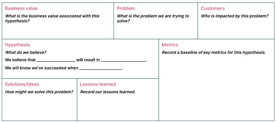 As for where to look for the needed data, third-party analytics tools make for excellent sources. You can also ask visitors to answer a short survey, provided it asks the right questions. Present your data in a hypothesis canvas like this template from Thoughtworks: