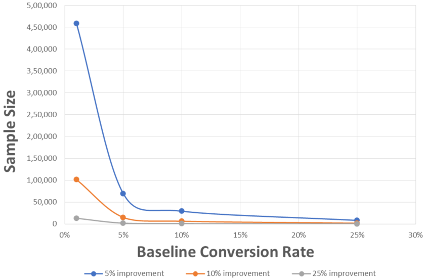 For example, testing a page or ad with a 1% baseline to see a 5% improvement requires a sample size of over 450,000 visitors. On the other hand, testing a page or ad with a 25% baseline to see if it can achieve a 25% improvement requires a sample size of just 200 visitors.