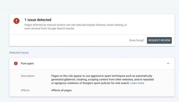 | Major spam problems | Refers to aggressive spam techniques such as scaled content abuse or repeated guideline violations | X | ✅ |
