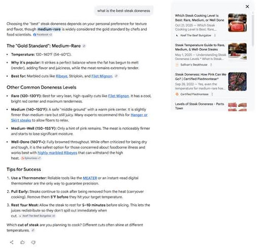 To understand how this technique works, let’s search for the best steak doneness. The one below was done using Google’s AI Mode.