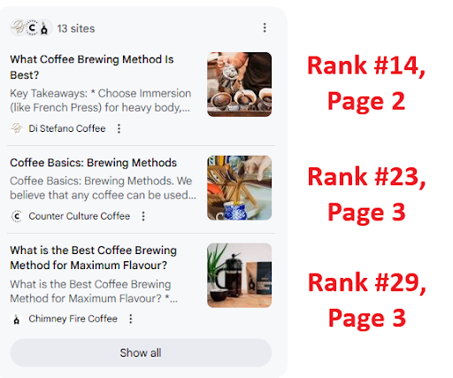 To further prove that point, I looked up the rankings for the sources AI Mode used for the search about coffee brewing methods. The first cited source wasn’t even in the top 10.