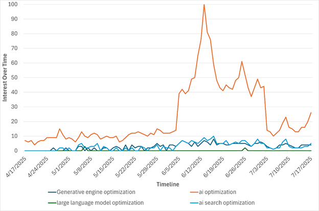 We weren’t kidding when we said these terms suddenly emerged last month. As data from Google Trends shows, interest in AI optimization (AIO) picked up steam at the start of June and reached its peak mid-month.