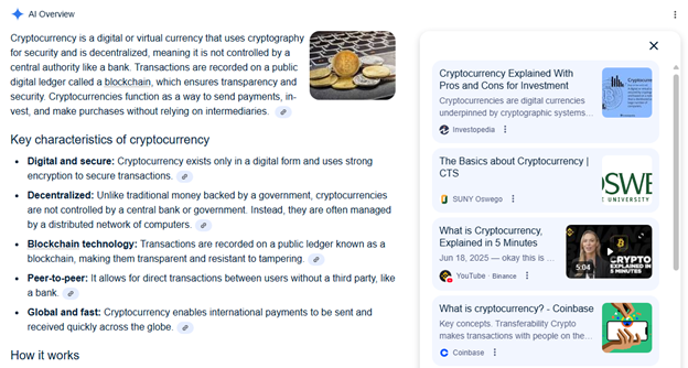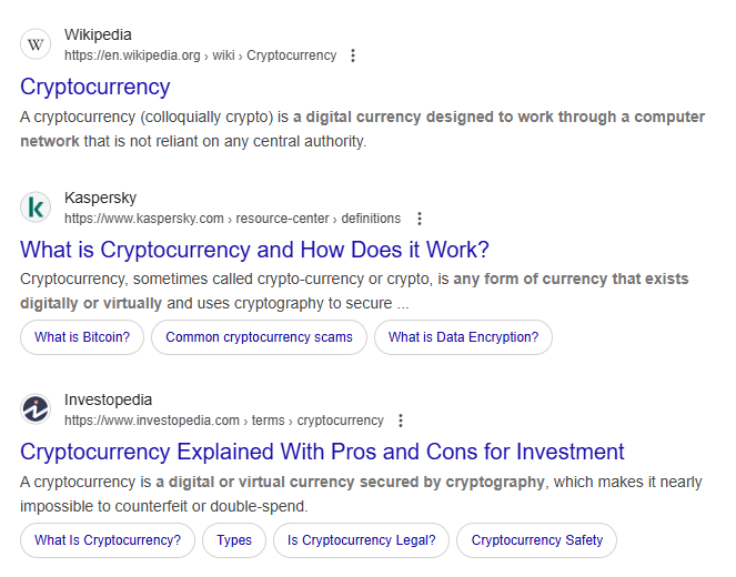 Here’s an example: searching for “what is cryptocurrency” shows that a Wikipedia entry is the top-ranked result. However, as a writer, I want my information to come from a firsthand source. Wikipedia won’t cut it, as it’s more of an encyclopedia than a financial website.