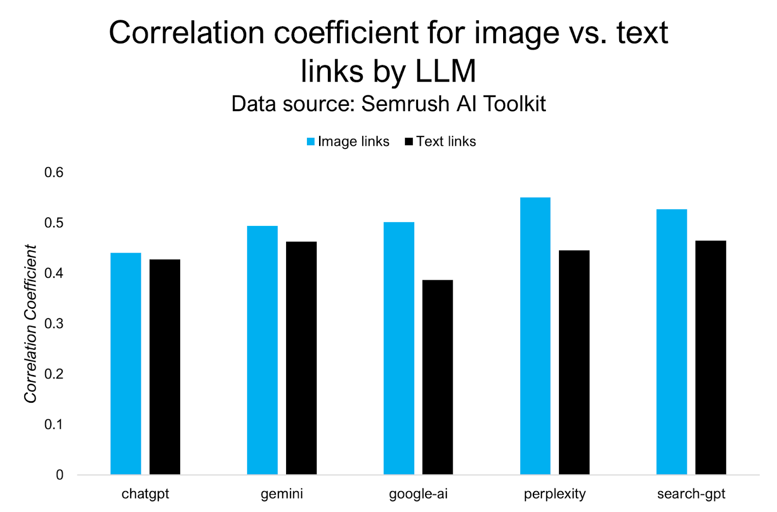 However, AI has made image link building worth considering. Indig’s study also discovered that image links have a higher chance of being mentioned in AI summaries than text links. This is the case across all five tools, but is most prominent in AI Overviews and Perplexity.