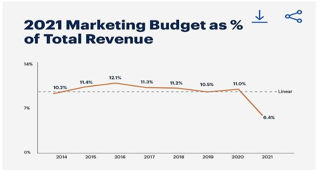Businesses spend about 7% and 10% of their total income on marketing their products but the budget reduced to 6.4% in 2021: