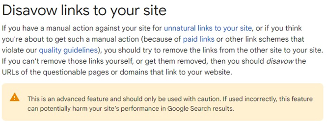 Another issue is that disavowing links can end up disavowing the good links as much as the bad ones. Google is well-aware of this that it has pinned yellow-box warnings in their disavow links resources, one on the help page: