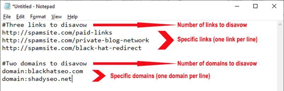 If, after much consideration, you opt for disavowing links, you’ll have to prepare the necessary file to send to Google for reconsideration. The file can be easily created in Notepad and consists of two sections.