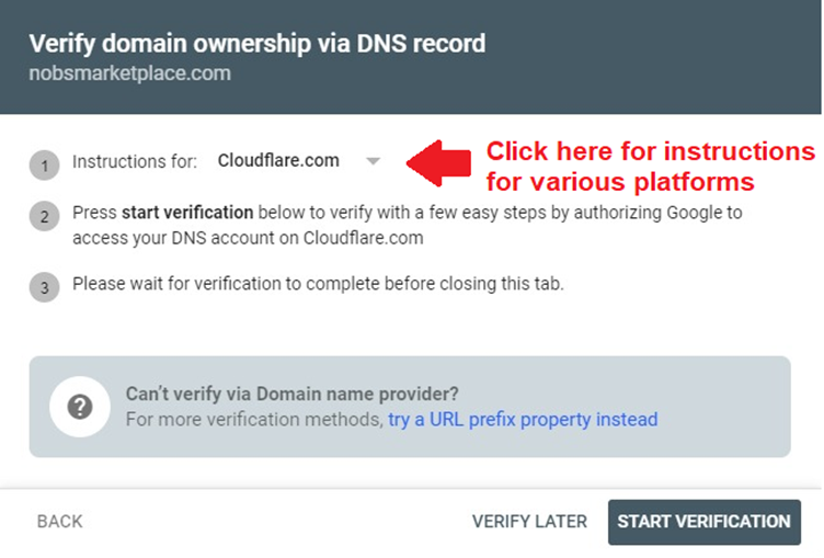 - Google will ask for confirmation whether or not you own the domain in question. Follow the instructions (depending on the hosting platform) and click ‘Start verification.’