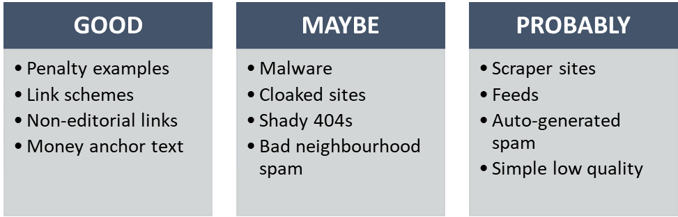- Simple low quality:These sites barely have any pages, if they have content at all. Google flat-out ignores them or counts them, depending on the circumstances.Instead, a good rule of thumb is to list domains and URLs as far as the Maybe group. Google will still take action against these examples, but it won’t hurt to disavow them if you don’t feel comfortable about them linking to your site.