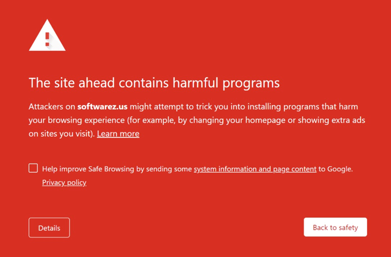 - Malware: Google (their browser, Chrome, to be precise) displays the warning below when visitors attempt to access a site that potentially contains malware. While this system means that Google is already aware of such sites, it pays to disavow them to be on the safe side.
