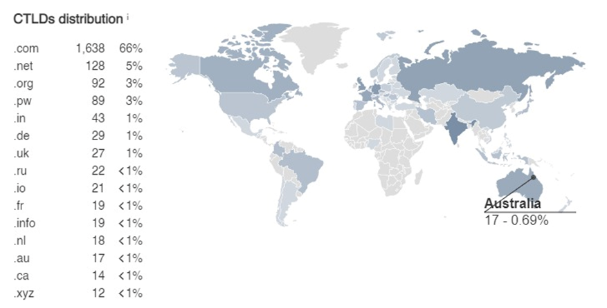 - The Country Code Top Level Domain (CTLD) Distribution map categorises referring domains according to their CTLDs (e.g., .com, .uk, .us). A red flag, in this case, involves unusually high traffic coming from anywhere but the business’s client base.