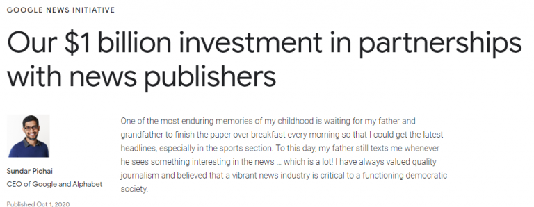 ‘Today I’m proud to announce Google is building on our long-term support with an initial $1 billion investment in partnerships with news publishers and the future of news.’