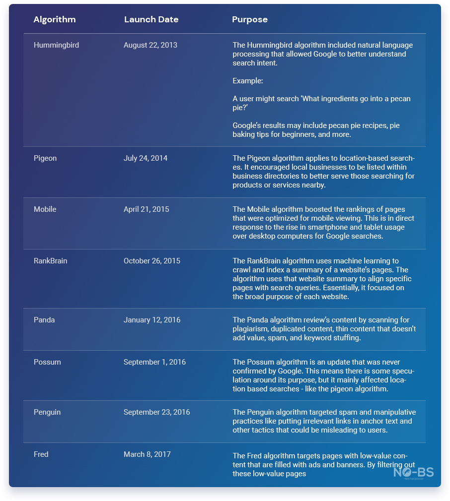 Google's algorithms compile and sort all of the information on the internet in a way that allows all users everywhere to get the best fit for their search query within the first 2 pages. Below is a comprehensive overview of Google’s most important algorithm updates.