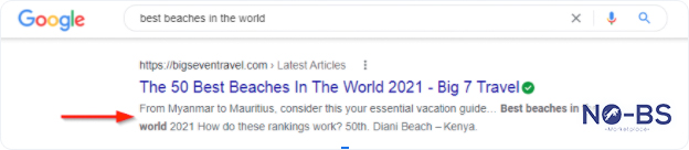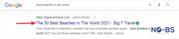 The title tag is the title that appears in a google search. This can be the same as or different from the headline of the article or page. In the example below for a search for the ‘best beaches in the world,’ you can see the title tag for this search result is ‘The 50 Best Beaches In The World 2021 - Big 7 Travel.’