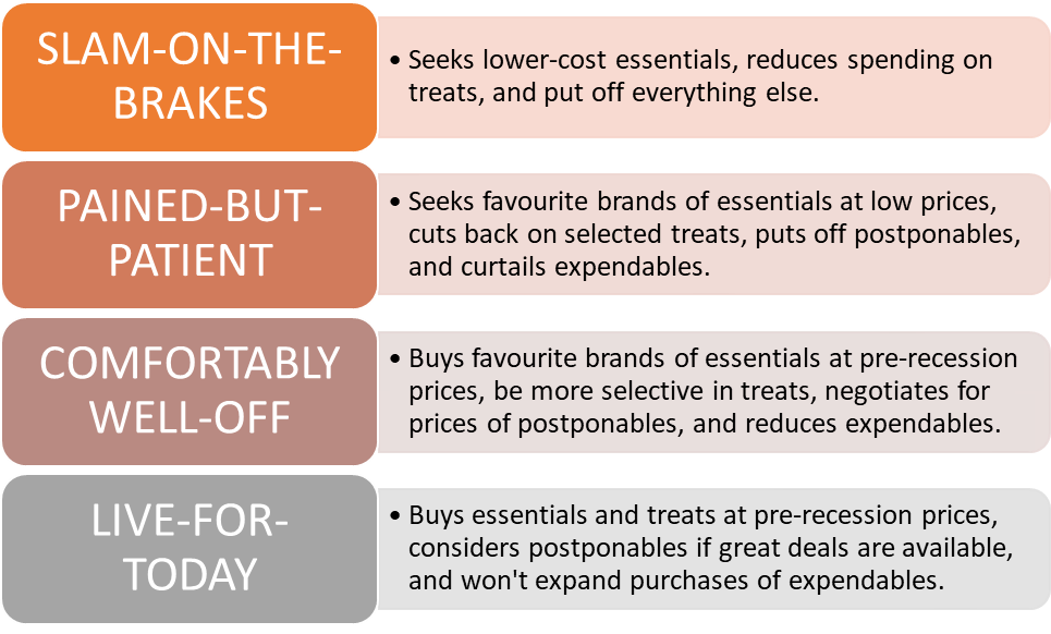 Notice that only the first three groups tend to be more frugal with their money in an economic downturn. That said, there’s a unique strategy to appeal to every consumer group that buys a certain item group. There’s even a strategy for selling expendables, even if it entails offering do-it-yourself solutions or waiting for consumers’ finances to improve.