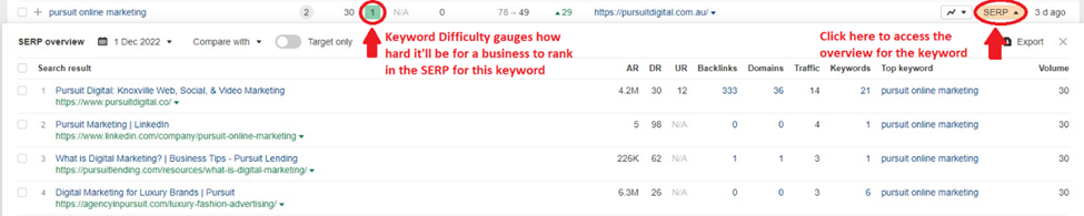 Conversions are a priority when a business wants more customers to do more than visit its website. Focusing on clicks is ideal if a business needs to increase traffic to its website. Lastly, visibility should be the primary goal if a business has to rank in search results. Save for manual cost-per-click bidding, all the strategies mentioned here are automated. - Perform a SERP analysisA search engine results page (SERP) analysis examines the nature of the SERP of a specific keyword to determine its features, difficulty in ranking, and the competitor’s advantages in this domain. Essentially, the analysis lets you know where to outrank the competition or rank without much competition.Third-party tools like the MozBar extension and Ahrefs SERP Checker provide a seamless way to conduct SERP analysis. In the latter’s case, the tool is also available on its flagship SEO analytics tool. Below is the analysis for the query ‘pursuit online marketing.’
