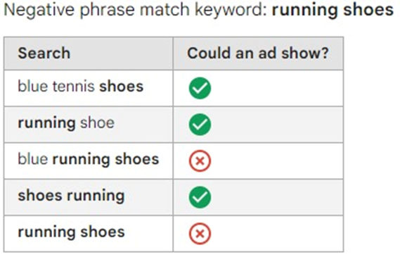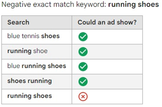 Google lets you exclude broad, phrase, or exact matches of keywords. Below are examples of how each match works.