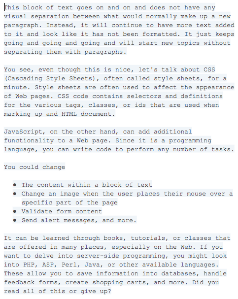 Formatting the article without subheadings, smaller paragraphs or bullet points can cause the content to seem bulky and never ending while reading. Large blocks of text can cause reader fatigue, this should be avoided at all cost.