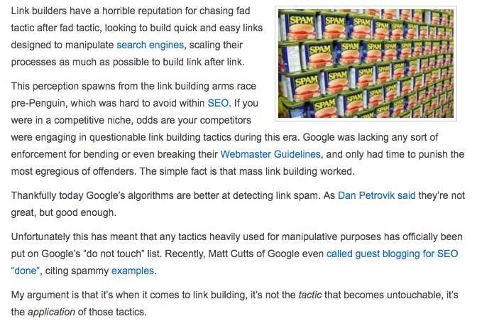 We all know guest posting generally helps you gain a link back to your website. While it’s ok to add one, maybe two links into the article, what’s not ok is adding a lot of links to the point it’s spammy when someone reads it. Avoid this as much as possible. If you see this example below it contains six different links.