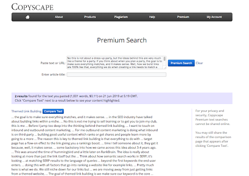 Here’s an example of duplicate content being flagged in Copyscape.com.
