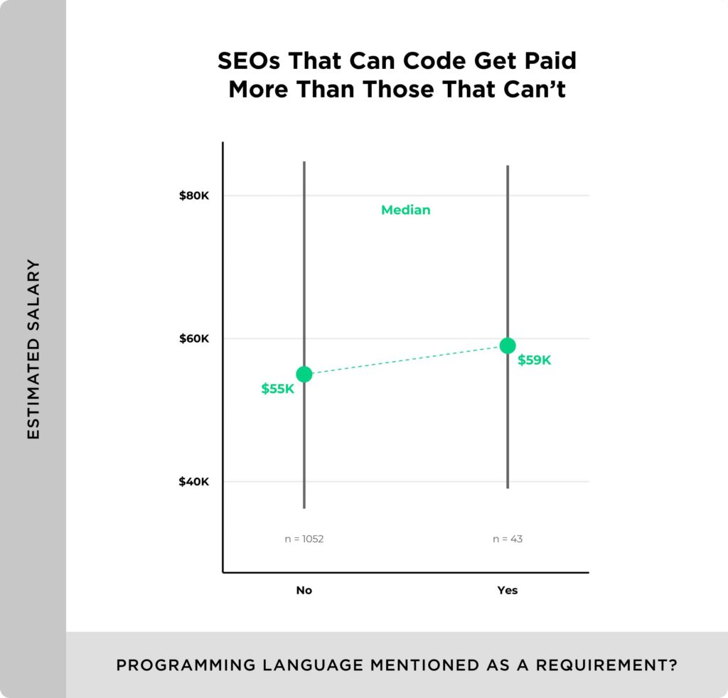Upskilling is another viable method. As you know, search engine optimization isn’t limited to what’s displayed on the surface. Algorithms also evaluate the site or page’s code to determine if it adheres to technical guidelines. In Backlinko’s study, the respondents with programming experience accounted for only 3.5% of the survey population but were paid 7% more.