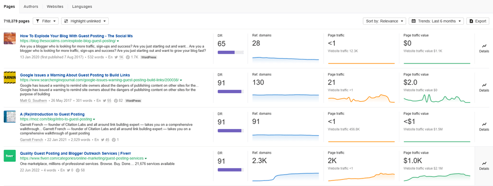 As an example, when you run the query “guest posting” on the tool, this is what you get.