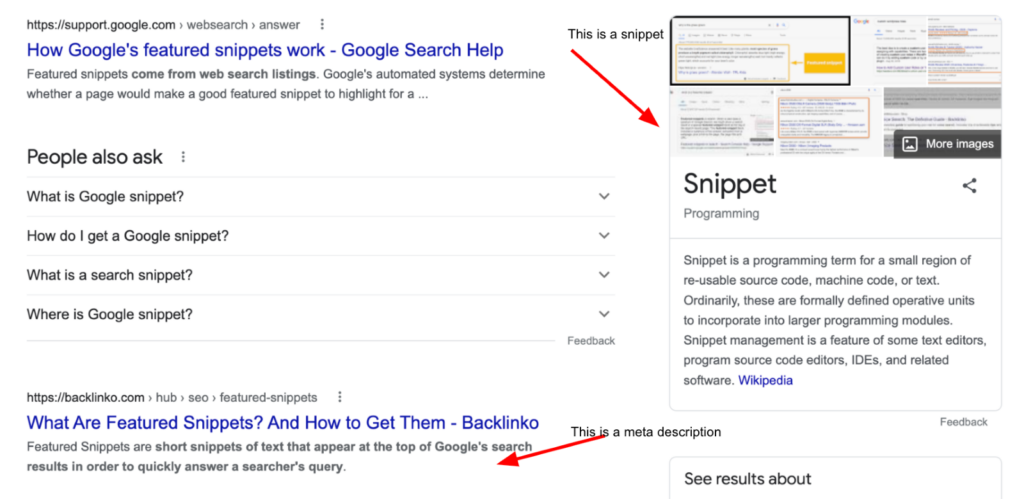 Keep in mind that snippets are what Google and other search engines show in the SERPs. (SERP stands for Search Engine Page Results.) Even if Google chooses not to use your meta description, having a well written one could also affect the snippet that’s shown to users.