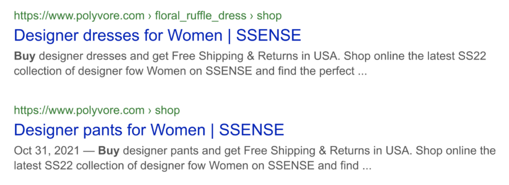 If you’re using the product name for the meta title, you can go even further by shifting the words around in the title and displaying the difference in size or color.