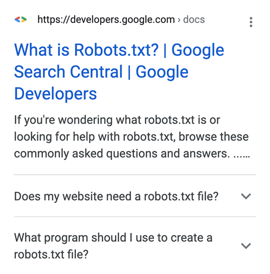 The FAQ, shorthand for “frequently asked question,” encloses answers to questions related to a topic in a drop-down box. These boxes can be independent ofsearch results or attached to one.
