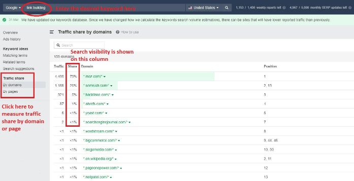 You can check a site or page’s search visibility with Ahrefs’ Keywords Explorer. Enter the keyword into the search bar and click whether you want to measure traffic share by domain or page. The figures are displayed in the second column.