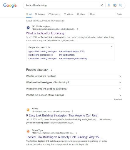 - Keyword rankingI probably don’t have to go in-depth about how indispensable keywords are in SEO. In link building, keywords comprise half of the winning formula, the other being backlinks. That’s how one of my blogs managed to be the top result for ‘tactical link building.’And before you ask, it’s still the top result—seven months after that post went live.