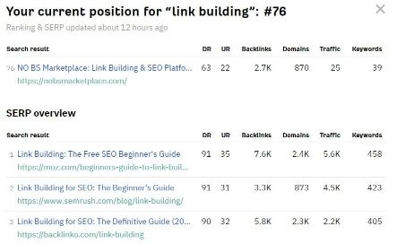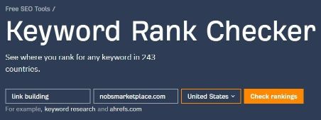Fortunately, tools such as Ahrefs’ Keyword Rank Checker exist for such a task. Using it is as easy as inputting the keyword and URL and selecting the country where the keyword’s being searched. For example, let’s find out how the NO-BS Marketplace home page fares in search queries for ‘link building’ within the United States.