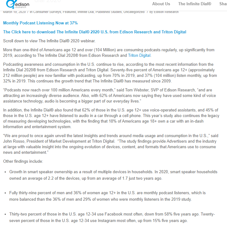 See for yourself. Here are a few numbers that show the rise of podcasts, thanks to the 2020 Infinite Dial report by Edison Research and Triton Digital: