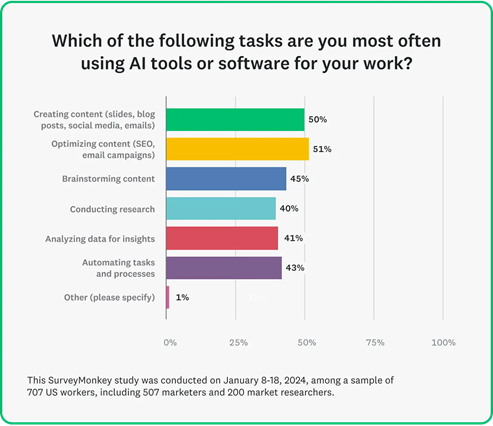 As the numbers from a SurveyMonkey study in 2024 show, AI tools are all but a staple of various business tasks. They become more important in SEO and content creation, with half saying they’re dependent on such tools. Considering how search engines have been introducing AI-powered features over the past years, the reliance on AI is understandable.