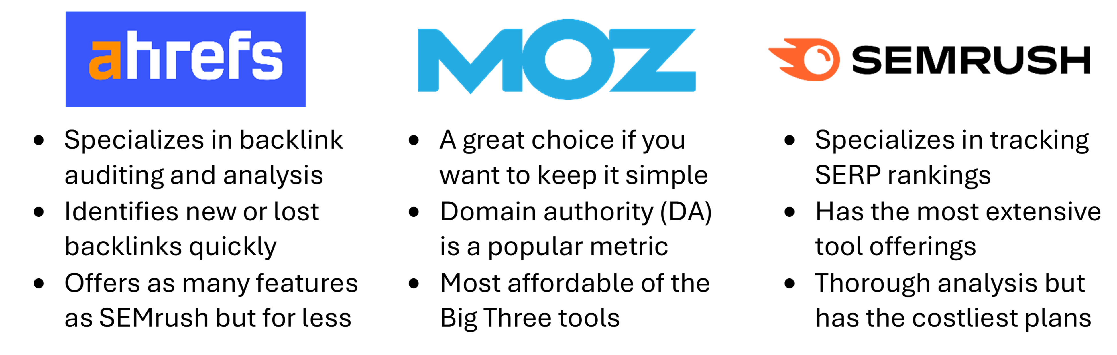 Measuring success in link building is made easy thanks to SEO analytics platforms, which integrate all you need in one interface. Of the dozens available, many in the SEO industry consider the Big Three to be Ahrefs, Moz, and SEMrush. But because they also have some of the priciest plans, having at least one of these should be enough.