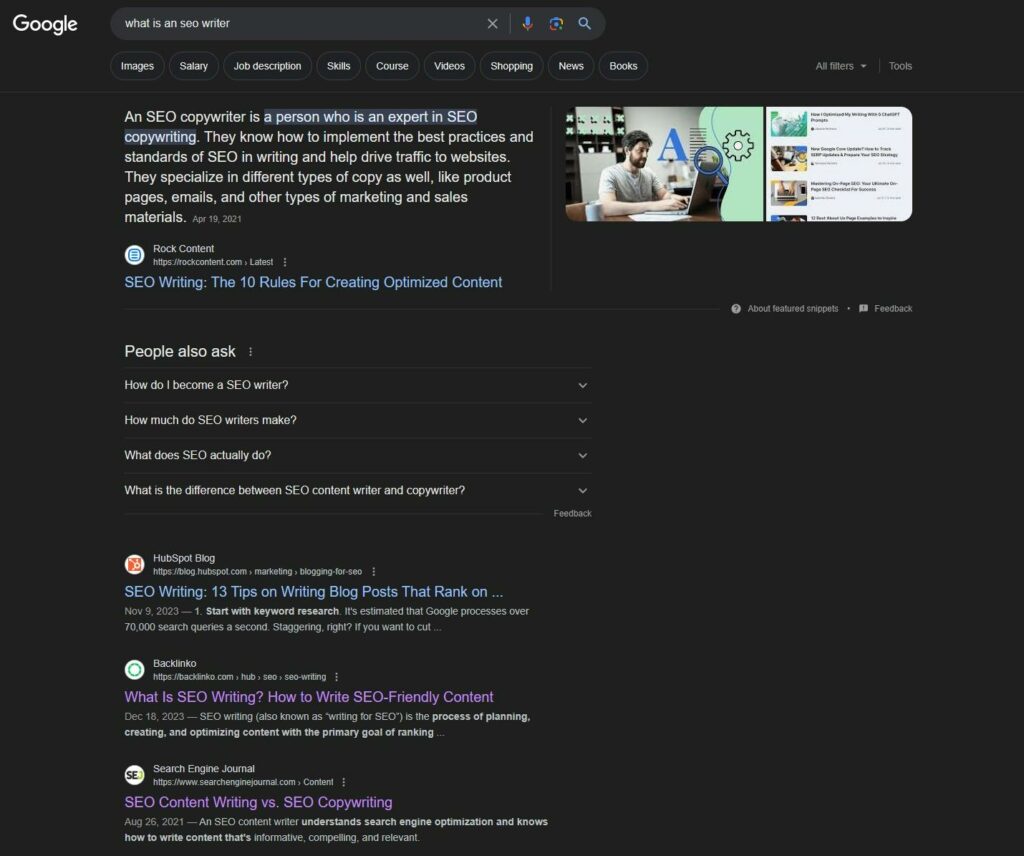 Naturally, informational keywords will have articles and blog posts for search results, as they’re the best means of fulfilling users’ need for information. I can get this blog post to rank for the term “what is an SEO writer,” seeing the rest are also blog posts.