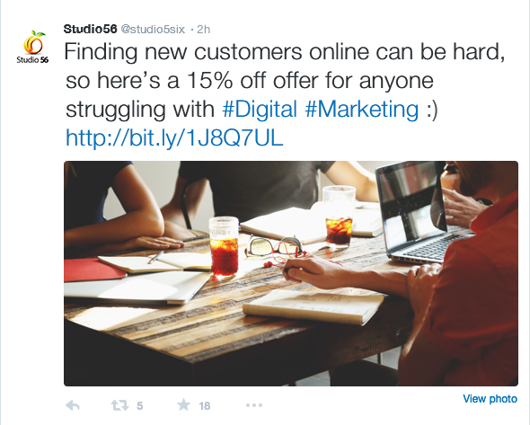 - Include discount or special offer: people just love seeing words “special offer” or “15% off” everywhere! Add the offer in your tweet along with your link and a hashtag related to your brand, and you will get those clicks.
